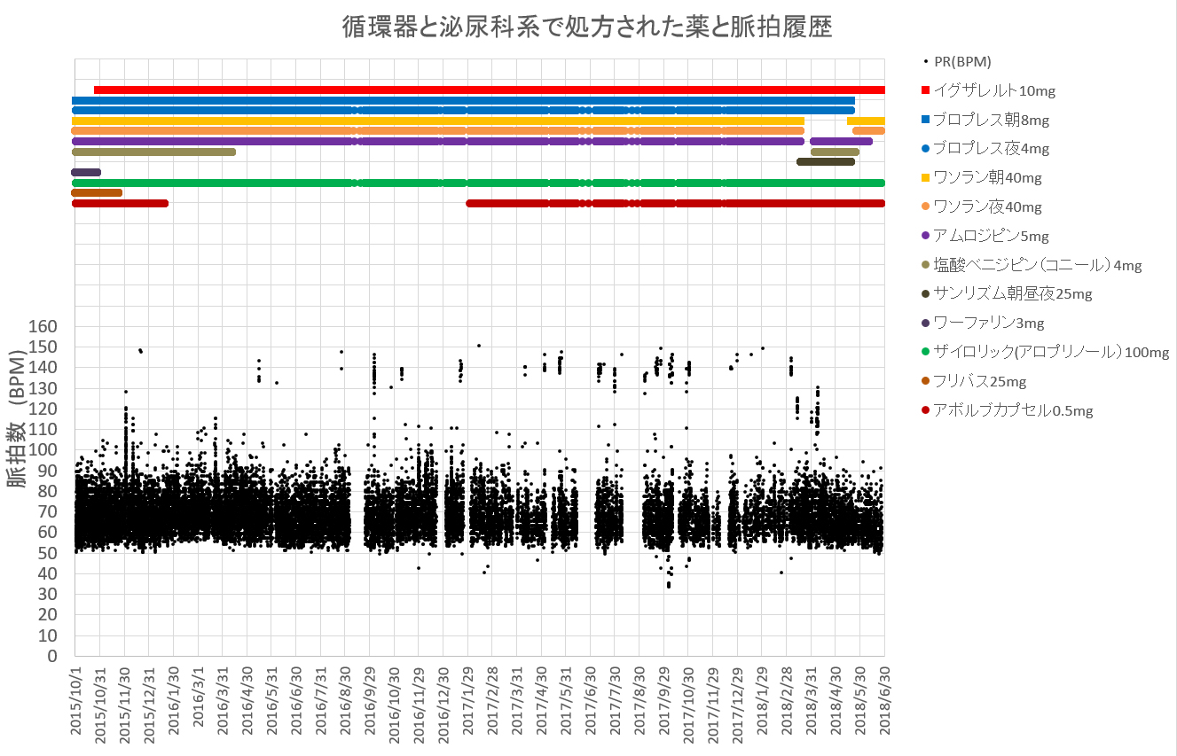 下図は私、85歳男性の服用薬と血圧の経過をプロットしたものである。