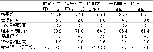 血圧上昇7.7/1.4 mmHg、脈拍数5BPM減少、脈圧6.3 mmHgの上昇といった様で、日本循環器学会の血圧目標値では正常の範囲内と見られる。