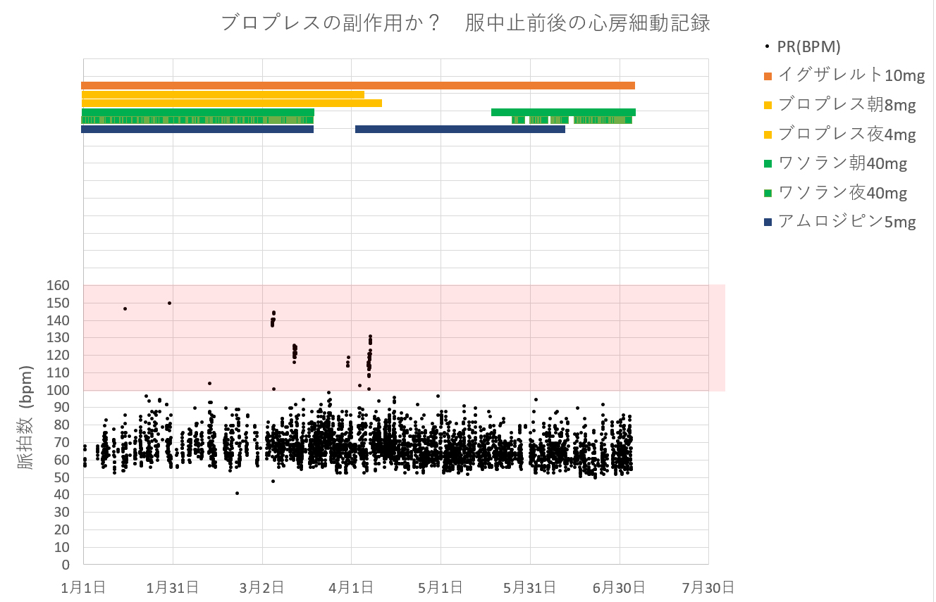 それよりも重要なことは、まだ証拠とするには早すぎるかもしれないが、ブロプレス中止以後、それまで月1、2回の頻度で起こっていた突発性心房細動が起こらなくなった。