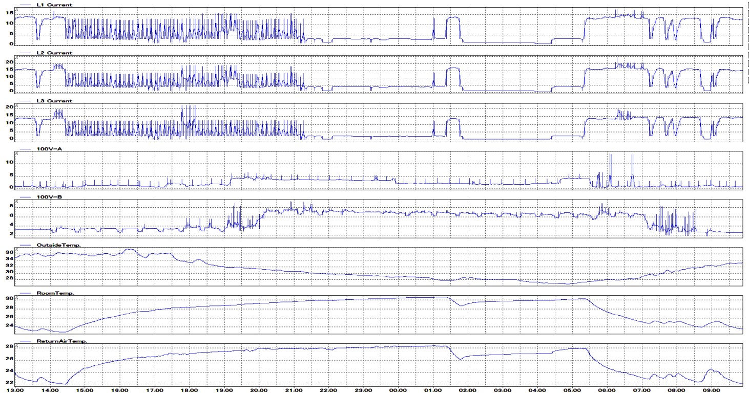 下のグラフは、エアコンの運転状態を常時記録している中からエアコン故障時の前後の動作電力、外気温・室内温度を記録したもので、上から3段はエアコン三相電力電源電流記録。温度記録は下から3段で、上から外気温、室内温度、エアコン室内機吸気温度である。