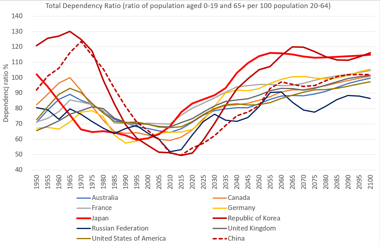 この中で、日本(赤色)は1950-1970年代これらの国々の中では少し異なった傾向を示し、1950年100%であったものが年とともに減少し、1995年日本経済のバブル期の頂点と生産世代人口の極大期が一致している。以後急速な高齢化により2035-40年には再び100%を超える。これは非生産年齢層人口が生産年齢層の人口を上回ることを表す、そして2055年にはこの比率が1.2倍弱のピークを迎える。韓国も少し遅れて日本の場合と同じ予測を示している。