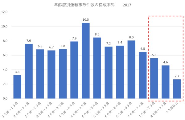 - 上のグラフは事故件数の年齢層別構成比を描いたもので、年齢層別にみると16歳~19歳層を除いて高齢者層はすべての年齢層より少ない、赤線枠内75歳以上の事故件数率は全体の13%程度である。