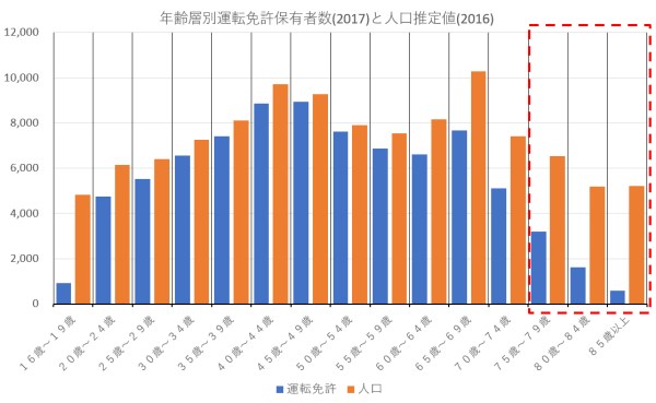 - 下のグラフは運転免許保有数と人口の年齢層別分布図であり(単位千)、先に書いたように、運転人口は明らかに高齢に向かい減少する。