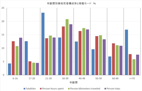 - 下のグラフは年齢層別交通事故死者の構成率について、所要時間、移動距離および外出回数の同構成率と比較したものである。