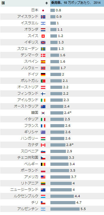 OECD32ヶ国中日本の乗用車事故死亡安全率順位は第一位 歩行中では安全順位は25位