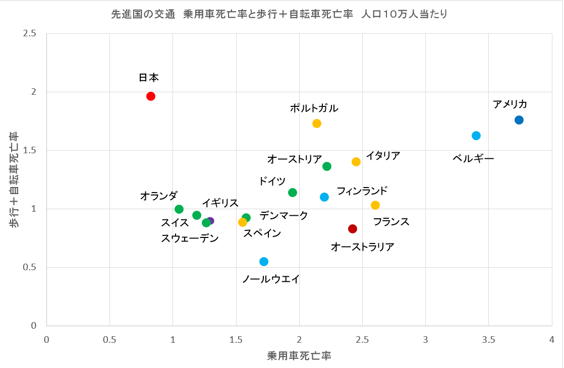 下の図は。OECDに報告された主な先進国のデータにより、乗用車乗用中死亡数と歩行+自転車利用中の死亡数の相関図である(人口10万人当たり)。