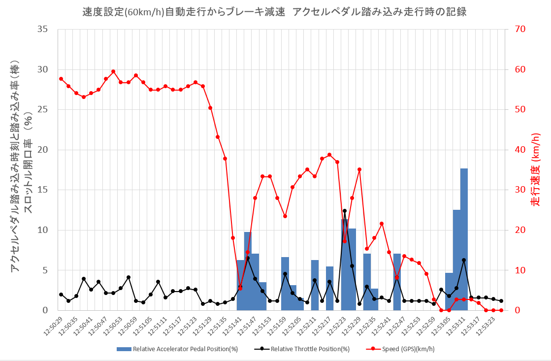 自動巡行速度設定中(60km/h設定時)グラフの前半ではアクセルペダルペダルを踏み込む必要がなく足をペダルから離しての走行中の場合で、スロットルが自動的に開閉し走行速度を設定値に保っていることが分かる。ブレーキを踏むことで自動設定が外れ速度を落とすことが出来る。後半の35km/h以下ではアクセルを踏んで加速、惰行走行で減速、ブレーキで停止など旧来の人的運転の走行状態を示す。