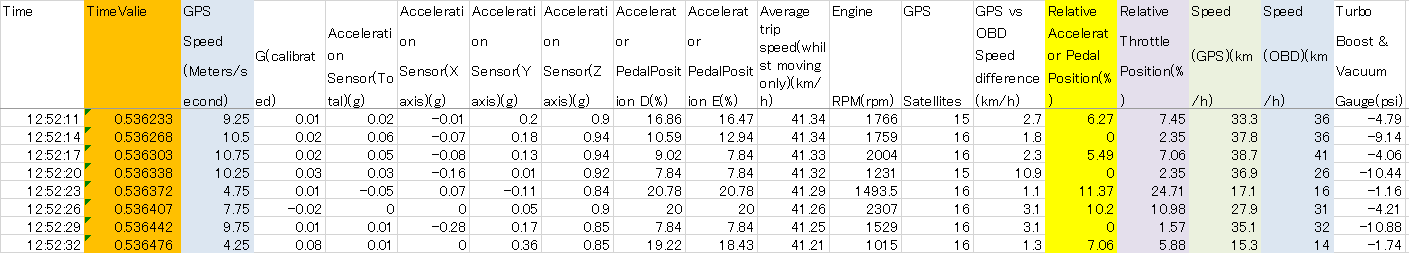 上記のデータは、ビジョンゼロの発祥地(人間が運転する以上事故を皆無にできないという科学的事実に基づいた安全認識)スウェーデンのボルボ2013 V40 T4 セーフティーパッケージ付きの車の市販車の場合である。この車はさらに歩行者保護用のエアーバッグも装備している。OBD2で記録されたエクセルファイルの一例を示す。