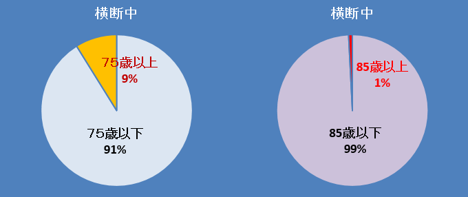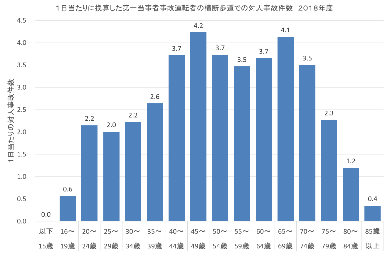 これで見ると40歳~74歳までの5歳間隔の運転者が関係した事故件数は1日当たり平均4件ほどの横断歩道上の対人事故件数であったのに対し、85歳上の運転者では0.4人、十分の1でしかない。または、84歳までの運転者の横断歩道上の対人事故件数の総数が1日当たり40件であるのに対し、85歳以上では二日に1件の割であるともいえる。