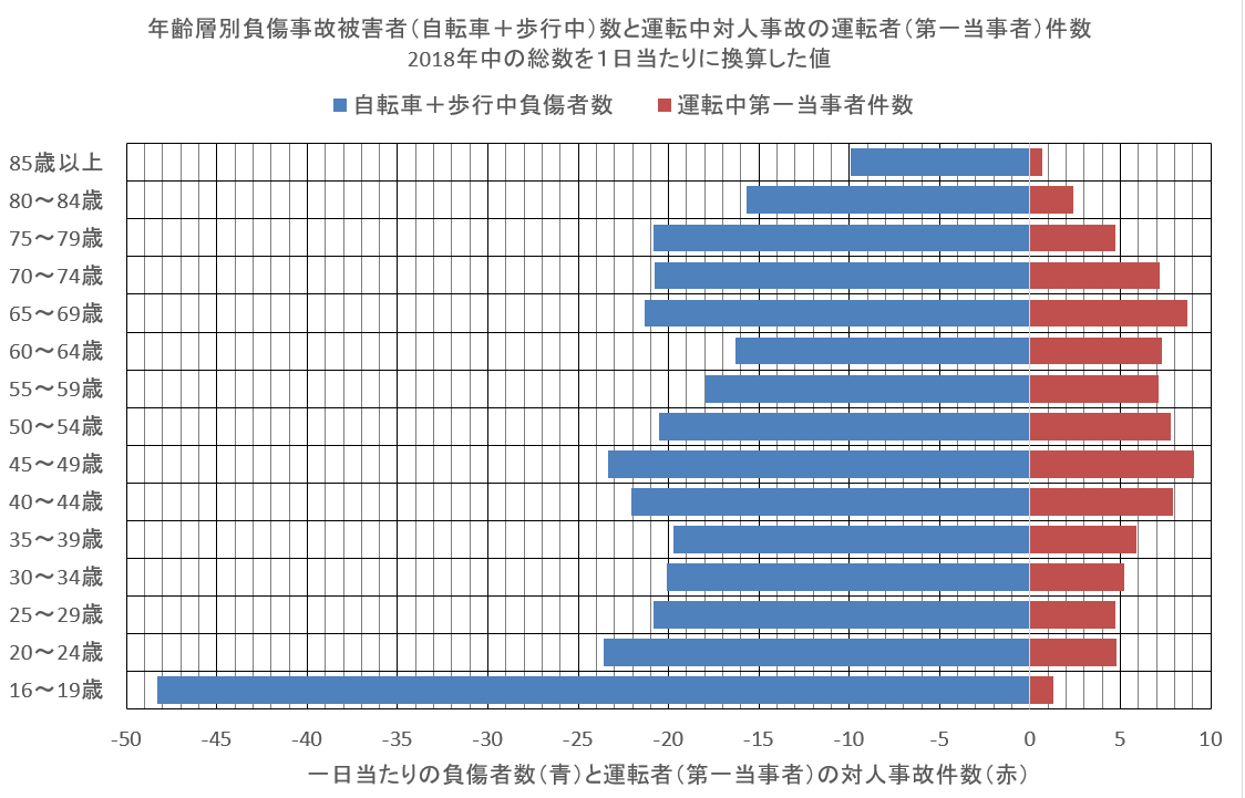 圧倒的に多い高校・大学初年学生期の事故。乗用車利用の不自由な85歳以上の高齢者。