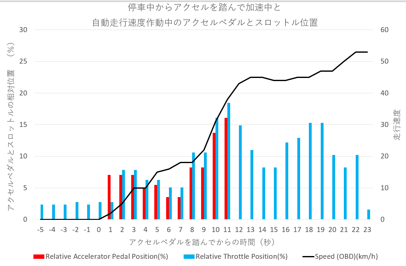 下のグラフは、先行車追随機能付きアダブティブ・クルーズ・コントロール作動中のアクセルペダル踏み込み状態、スロットルの開放位置、走行速度の同事記録の例である。この車ではクルーズコントロール速度を設定していても停止状態から時速30kmまではアクセルペダルを踏まなければ自動走行にはならない設定である。したがって停止状態ではエンジンのアイドリング状態を維持するためのスロットルが開いているが(ー5~0秒まで)、アクセルペダルを踏み込むと(0秒)1秒ほど遅れてスロットルが大きく開き、車が加速し始めることが分かる(1秒毎の記録設定時)。車速が30km/hを超えたところでアクセルペダルから足を離したと同時にアクセルペダルポジションは0%になっていることが分かる。以後は先行車に追随するためのスロットルが自動制御で作動している記録が残されている。アクセルペダルから足を離して走行、アクセルからブレーキへの踏み代えの必要はない。左足でブレーキを踏む習慣をつければ、なお踏み違いは起こらない。ブレーキペダルに足が触れればオート・クルーズ機能は解除され、アクセルペダルを踏まない限り減速する通常のマニュアル運転になる。