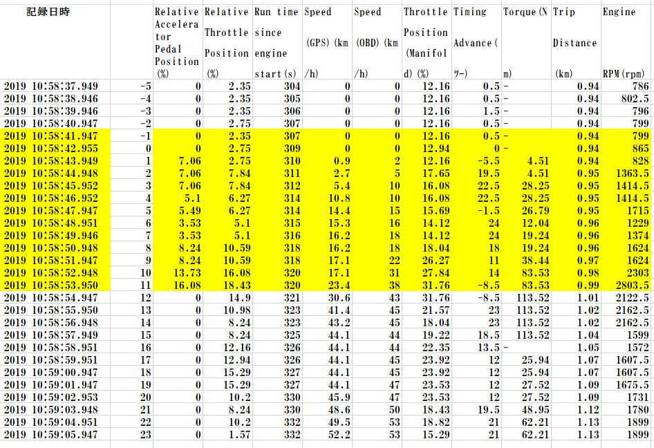 その証拠の一例として私が乗用しているボルボのOBD2端子からの走行中の情報を記録したデータの一例を示す。