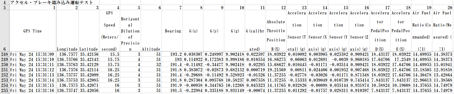 下のエクセルレコードの一例は、タブレットに市販アプリ“Torque” Engin Manegement Diagonostics and Tools で取ったログファイルの一例です。この例では69項目にわたって車の走行中のセンサーデータが1秒毎に記録されています。この場合は各動作状態の記録であり事故調査記録に特化したものではないので、ブレーキの作動記録は見当たらない。しかし、この記録でもアクセルの踏み込み率や、スロットルの開放率、エンジン回転数、車の急発進、急ブレーキ時の加速度などの記録が時系列で最高頻度0.1秒毎に記録することも出来るので事故原因の曖昧さのない分析データが得られるはずである。