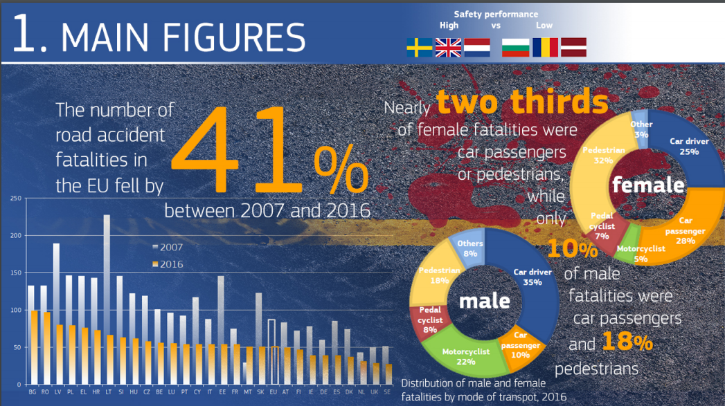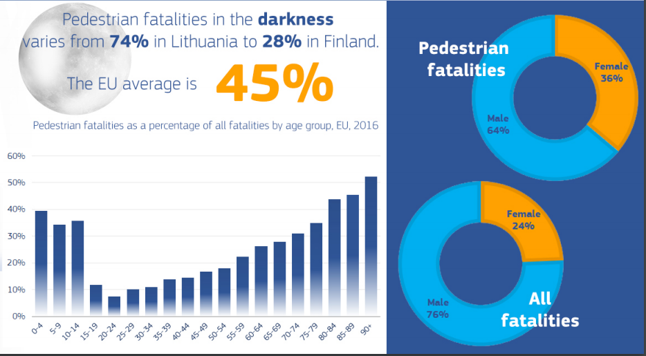 歩行者の年齢層別死亡事故率は14歳までと75歳以上が際立って多い。年齢層別に見るとヨーロッパ平均で45%、歩行中死者は男性64%、女性36%。