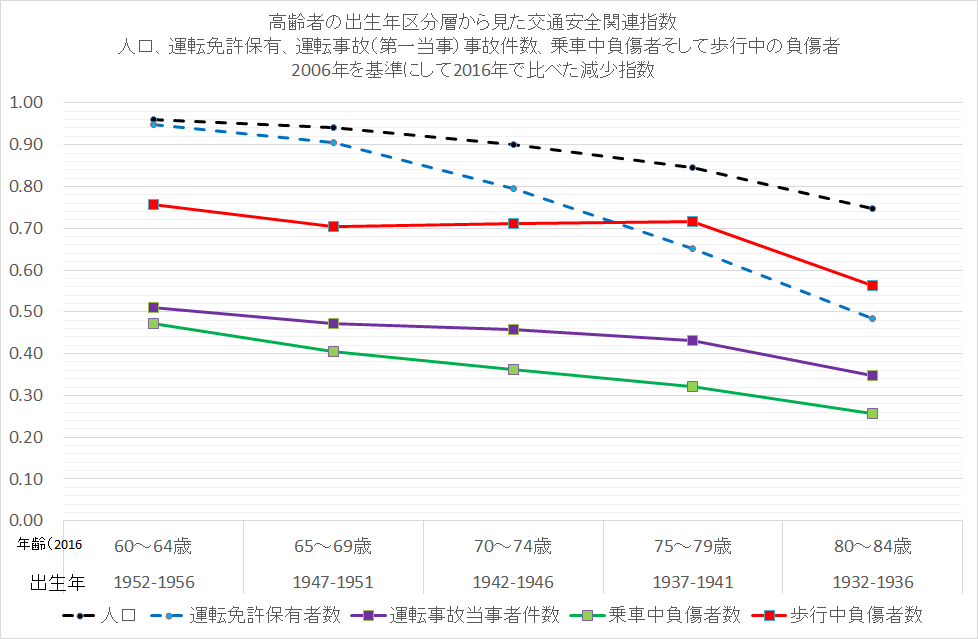 異常なのは歩行者負傷事故である。65歳から80歳まで人口の減少にもかかわらず歩行者負傷率は増加傾向を示している。