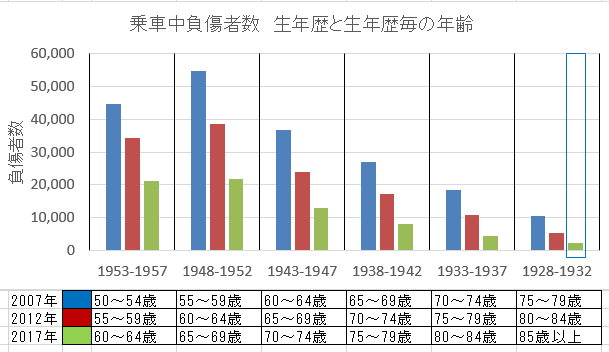 2017年時点で89歳となる生年は1928年であり、2007年で50歳の生年時は1957年である。この期間、戦前から敗戦、やっと貧しさから抜け出す兆候が見え始めた1957年まで、 この間に第一次ベイビーブーマーの人口増 等、多様な時代を背景に育った人達、5年区分の母集団が相互に均一とは言えない。したがってこの分析では、同一生年構成区分について2007年、2012年と2017年のデータを追跡、比較する方法をとった。