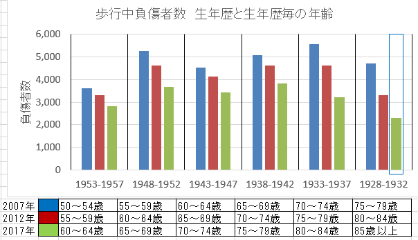 総てのグラフで見える1948年から1952年生年層の増加は、ベイビーブーマーの人口増のためであり、危険運転層ではない。今後この年齢層が高齢層側に移動するため高齢運転者の事故も高齢側に移動することとなる。これは,高齢運転者の危険運転のせいではない。交通需要が増えれば事故も増加するには当たり前、にもかかわらず現状は第5図のグラフのように自動車乗用中の事故は高齢に向かい減少し続けている。半面、第6図のように、歩行中の事故は70歳代まで増加傾向にある。高齢者の乗用車利用をしにくくし高齢者道路歩行の人口増を即す政策は、結果として交通事故を増加させることになる。そして高齢歩行者事故に関与する運転者は圧倒的に多い有職年齢の運転者であり、少数の高齢運転者ではありえない。
