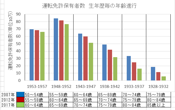 このデータベースでは乗用車の運転者だけのデータは無いので運転中事故の第一当事者となった事故件数の2007年から2017年10年間の5年階級年齢層別・類型別事故、及びそれに関連したデータを用いた。直接表示されていない人口、運転免許保有数等は事故件数の数と人口10万人当たりの表から算出した、集計対象となっている分母となる集団の基本属性として生年歴(誕生年区間)を併記した。
