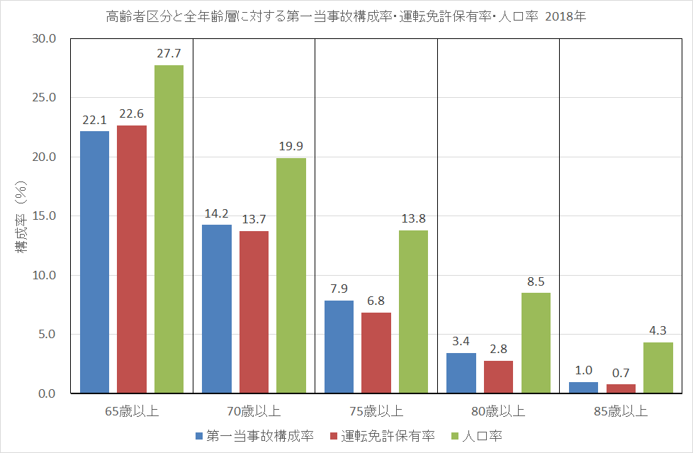人口構成率を道路需要とすれば、日本の高齢運転者は自主的に運転をやめ、事故責任の重い第一当事者事故は急激に減少している。これが真実であり、日本の高齢運転者の正常な判断力を実証している。