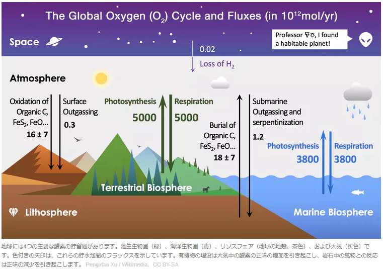 地球には4つの主要な酸素の貯留層があります。陸生生物圏(緑)、海洋生物圏(青)、リソスフェア(地球の地殻、茶色)、および大気(灰色)です。色付きの矢印は、これらの貯水池間のフラックスを示しています。有機物の埋没は大気中の残留酸素の増加を引き起こし、岩石中の鉱物との反応は減少を引き起こします。 Pengxiao Xu / Wikimedia、CC BY-SA