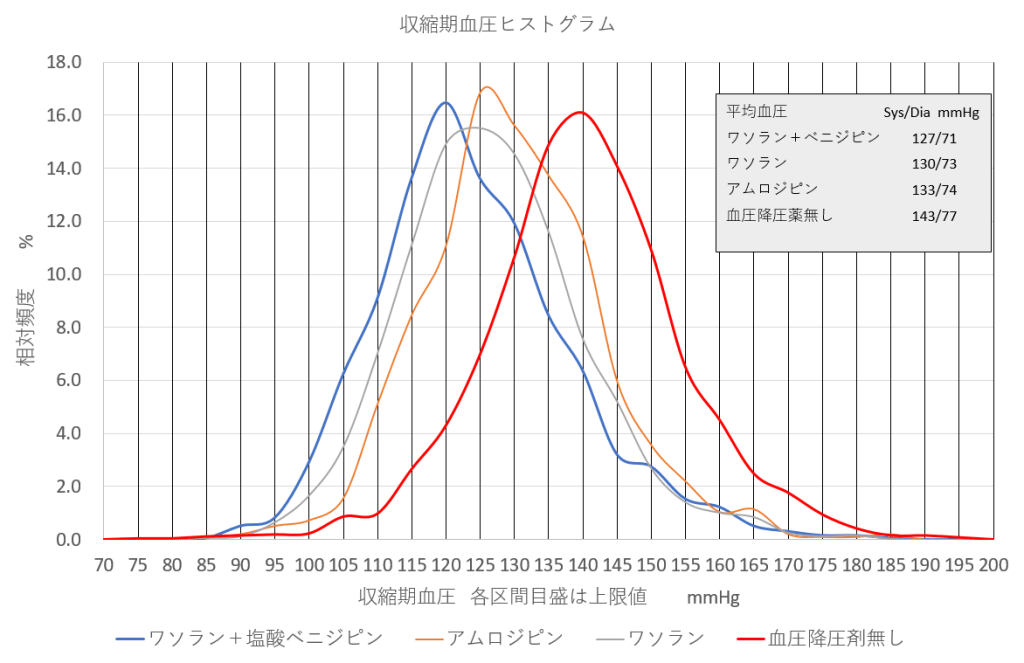 自由生活時血圧は変動が大きいことは知られている。したがって平均値だけではその全容は判断できない。下のグラフは、降圧薬服別に血圧値の記録 頻度を表したものである。何れの場合も平均値の周りに広い出現頻度分布をしていることが分かる。