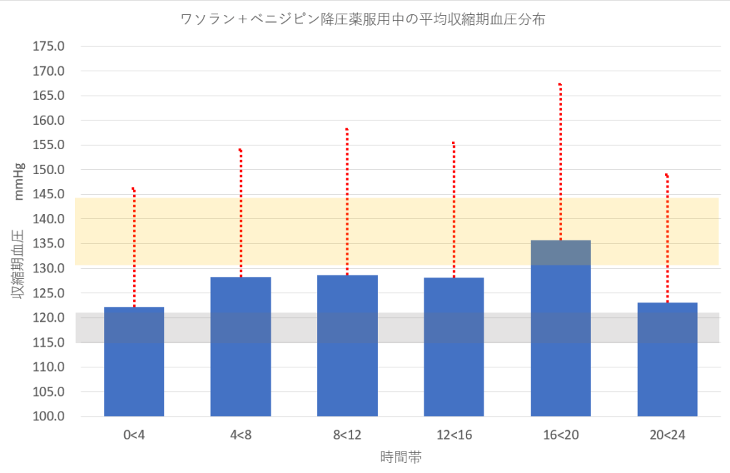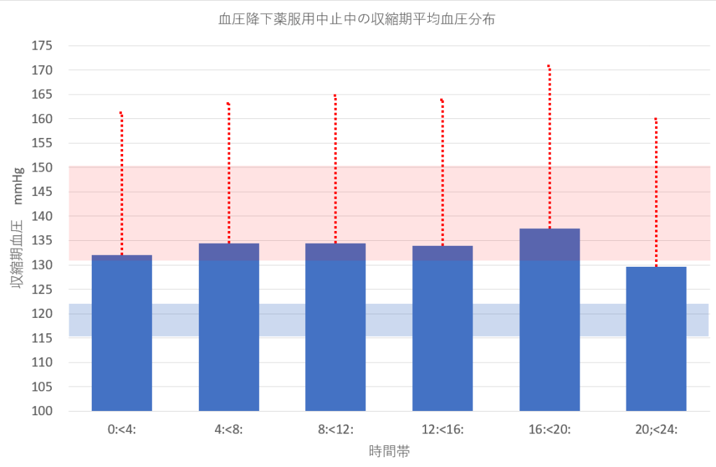 下のグラフは私の場合で、30分間隔計測で、血圧降下薬服用中と降下薬をすべて服用しない場合の収縮期血圧の4時間平均と2SD上限限界値である。塗りつぶし帯は上記の各研究者による正常値の範囲を示したものである。降圧薬の介入がない場合明らかに高血圧症と判断されよう。