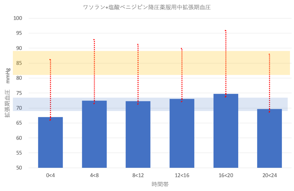 下のグラフは、降圧薬コントロール中のものでそれぞれ収縮期と拡張期の様子である。夜間および就寝中の血圧値は標準に近いまでにコントロールされているように見える。