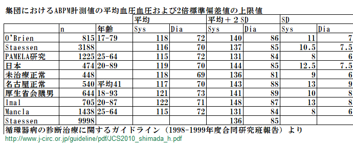 このガイドラインの付表4から正常血圧グループの平均値とその標準偏差、平均からの2SDの上限値を拾って表にしたのが下表である。血圧変動の標準偏差は8~16mmHgの範囲が見られる。95%確率変動範囲は±25mmHgにも達している。