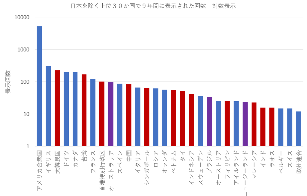 アメリカは単独で多いが、地域別に分けると、欧米(青色)15ヶ国、アジア(暗赤色)12ヶ国、南半球3ヶ国(紫)が含まれる。 アジアでは、韓国、台湾、香港、中国からの表示数が多いことがわかる(暗赤色)