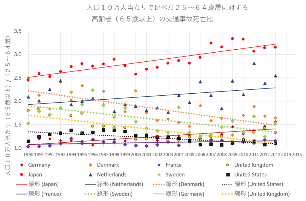 上記グラフのデータは、それぞれの年齢層で人口10万人あたりの交通事故死亡数に基づいて計算した値である。したがって人口の高齢化率の国による違いは一応消去されているとみろべきであろう。