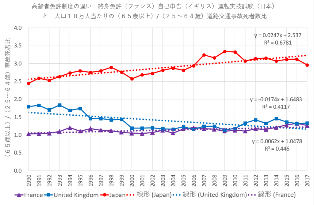 下のグラフは、高齢者の運転免許継続保有制度の極端に異なった三ヶ国について、高齢者道路交通事故死者数比を示したものである。ここでの死者数は、歩行、自転車を含む全道路事故死者である。