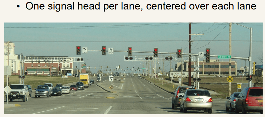 直感的で見誤りの少ない安全な道路信号、各レーン毎に進行方向上に表示、左折の場合は専用信号。