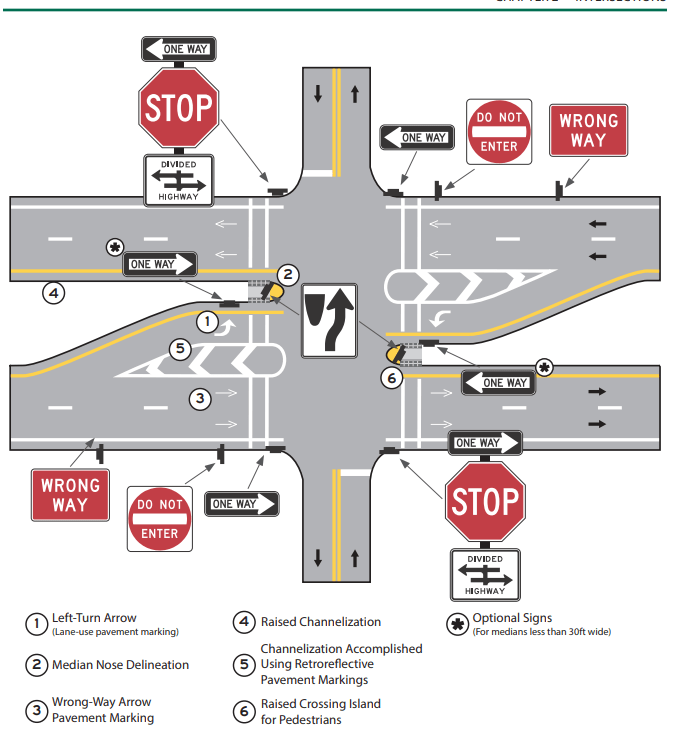 双方向単線道路より複車線の双方向分離交差点に入る場合。一方通行、進入禁止の標識、見落として逆行した場合間違いの警告と2重の標識。中央分離帯がある場合の進路の標識等。