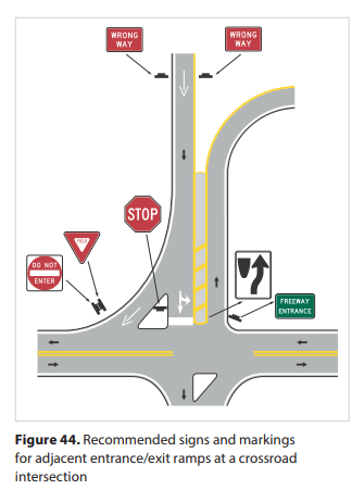 進行方向左側の側帯に進行の間違いを警告する2重の標識例。