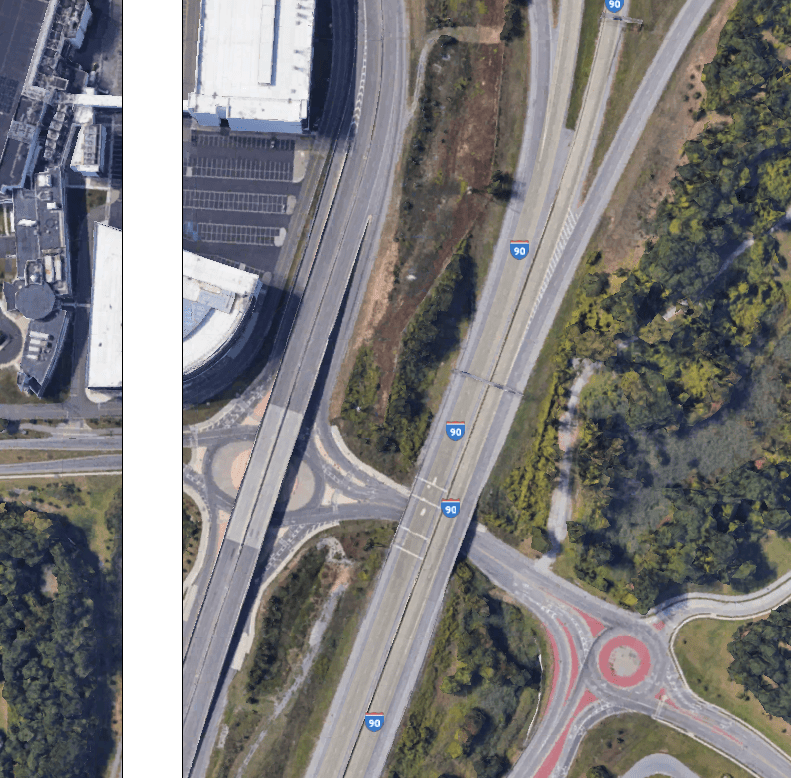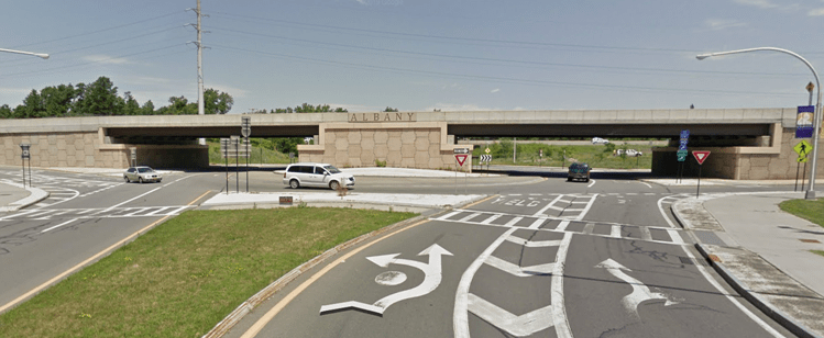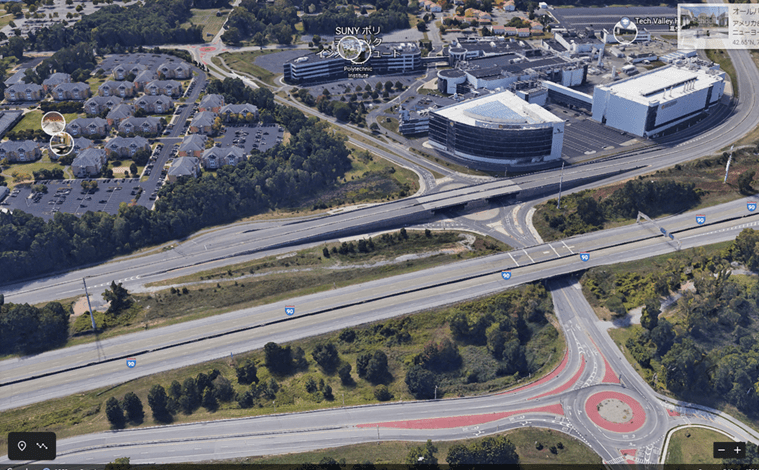 画像で見る三つのラウンドアバウト交差点。左右に走る上段の道路ワシントンアヴェニューは左側に向かい、ニューヨーク州立大学、州政府の各種役所のキャンパスが続く州内外からの訪問者の出入りが多い交通の出入り口といえる場所。