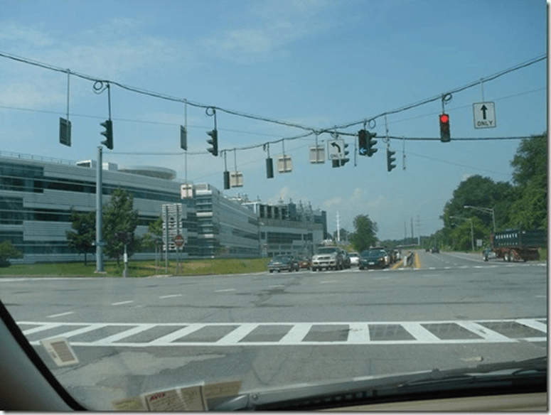 最初のラウンドアバウト交差点手前、高架橋上は市内主要道ワシントンアベニュー。アメリカではラウンドアバウト交差点は少ないので路面に進行方法のマークが詳細に指示されている。