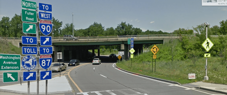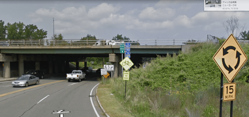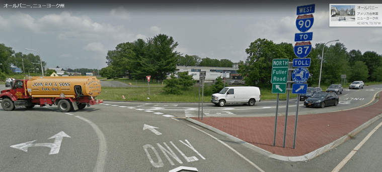 下の画像は、ニューヨーク州の州都オーバニー市(Albany)の西の高速道路網への主要出入口。中央の左右に走る高速道はアメリカ大陸最北の東西縦貫道ルート90、この画像すぐ右で、主要高速道インターチェンジに向かう。そこでは、ニューヨーク州を貫く有料道路ニューヨークスルーウェイ、ボストン方面90、北上してカナダに行くルート87等、大陸高速道の要衝ともいえる分岐点である。