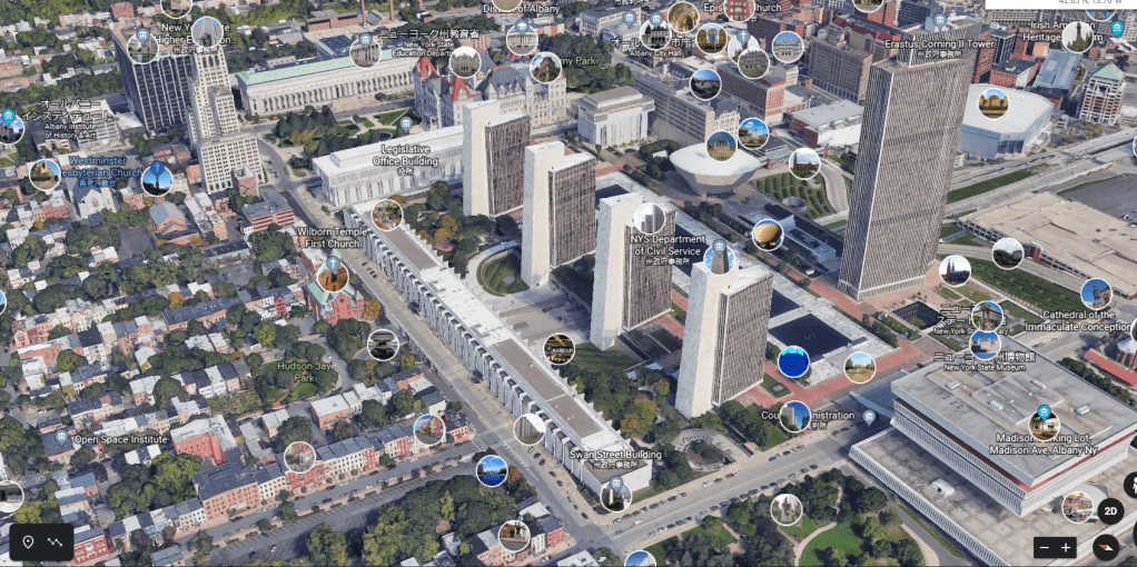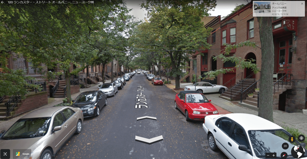 アメリカニューヨーク州の州都オーバニー(Albany)の中心部、グーグル映像。上端横方向に旧州政府官庁や銀行などの並ぶ地域が一部見えるが、下部三分の二は、以前住居環境が悪く人々が逃げ出した後の治安に不安のある風致地区でした。