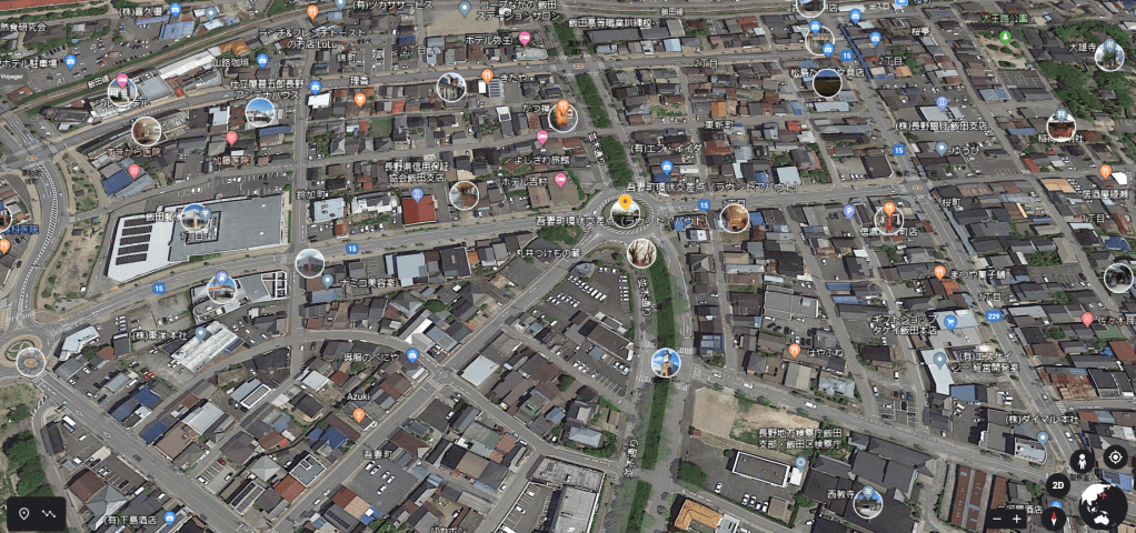 一例として、長野県吾妻町にあるラウンドアバウト交差点とその周囲の道路の状況をグーグルアースで見てみたのが下の映像である。この地勢では中央のラウンドアバウト交差点を避けて通り抜けることはどの方向にでも容易にであろう。