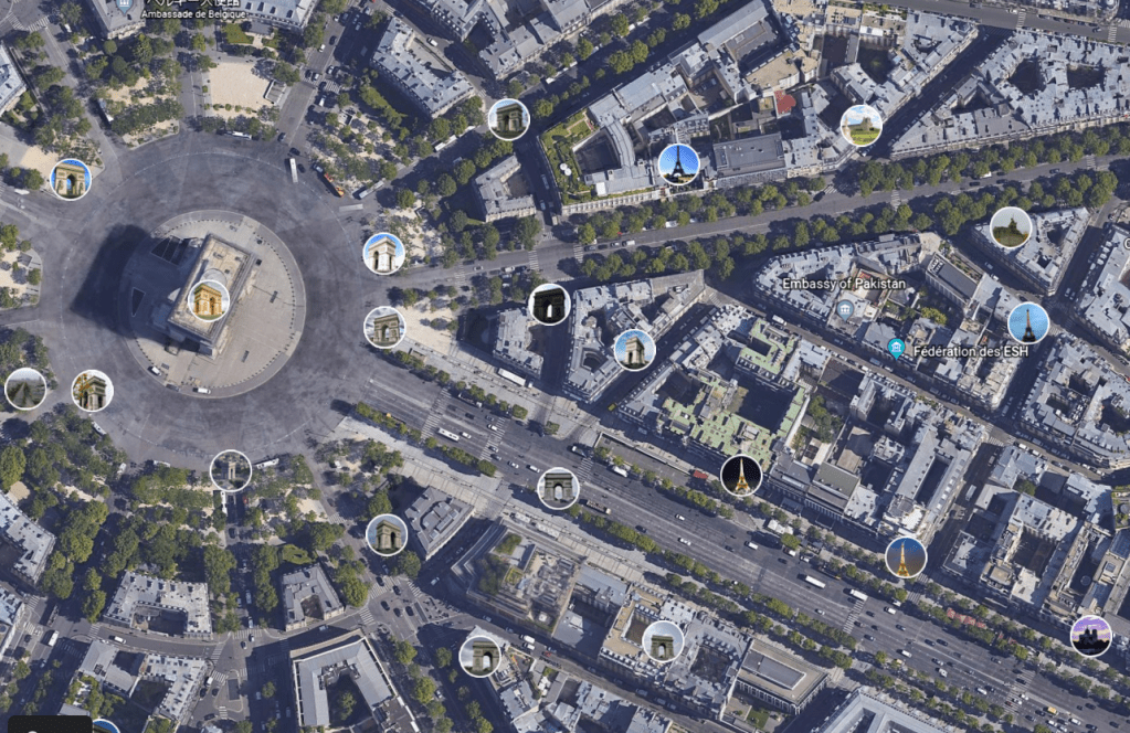 路面マークの無い広い環状道路からシャンゼリゼ―に流れ込んでくる車の大群。環状路面上では走行区分線無し、まるで駅前の広い歩道の歩行者の様な車の波。