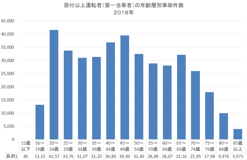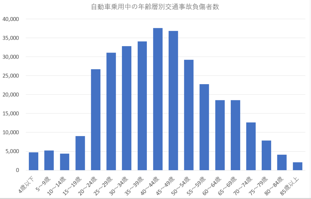その証拠として、2018年度の自動車乗用中の年齢層別負傷者数の実勢は下のグラフのようである。これは同乗者も含むため、運転免許のない未成年、あるいは同乗者人数も数に入っている。いずれにしても有職年代では車運転人口が圧倒的に多いからであるがこれが現実の道路交通事故頻度の実勢データである。死亡者分布とは大きく異なる。