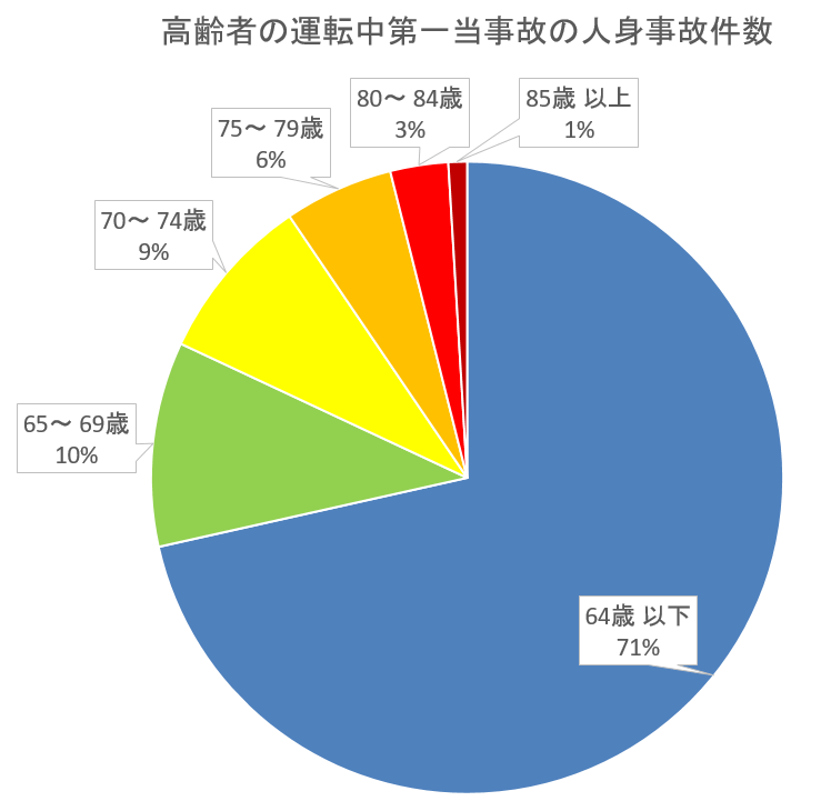 警察庁の2018年交通事故データベースから運転者が第一当事者となった事故件数について、高齢者の年齢層別事故件数を64歳以下の運転者と比べて円グラフで示した。責任の重い運転者事故(第一当事者)の71%は64歳以下の運転者が関与し、高齢者区分を75歳とすれば高齢者の責任が重い事故件数は10%、85歳以上では1%程度である。