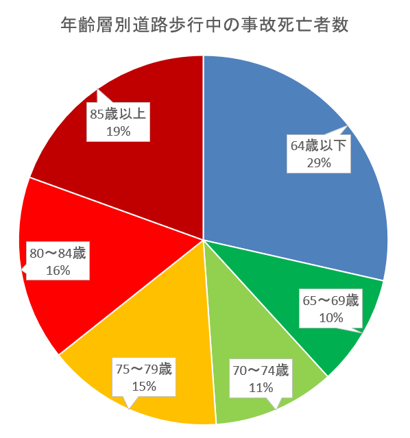 歩行中の事故死者の71%は65歳以上の高齢者であり、50%は75歳以上である。