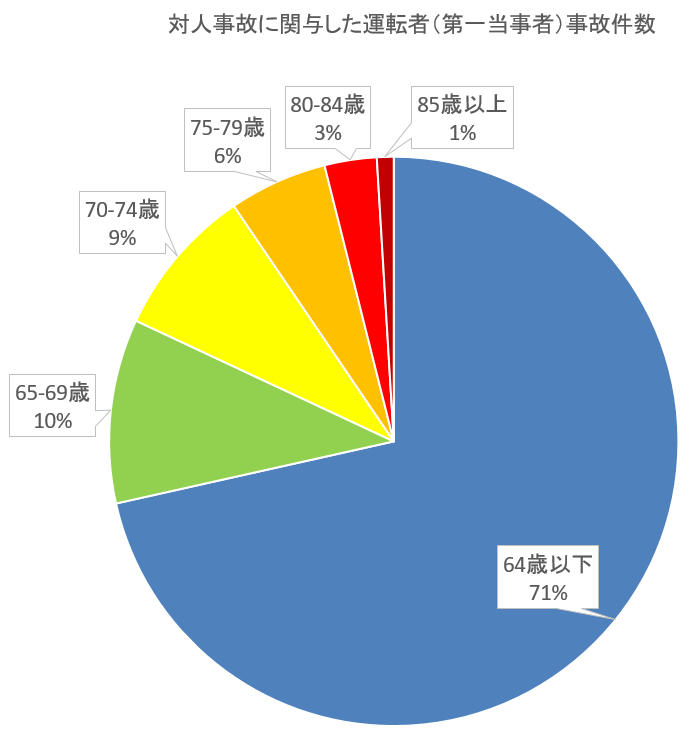 日本の実勢は、高齢運転者の運転事故は決して多くない。下の円グラフはその一例である。一般に大部分の高齢者は、身体的運動機能、視力など運転に不利な条件を自覚し、ラッシュアワーや、天候の悪い時、夜間を避けるなど、自己規制の結果が、この安全運転を実現している証拠であろう。
