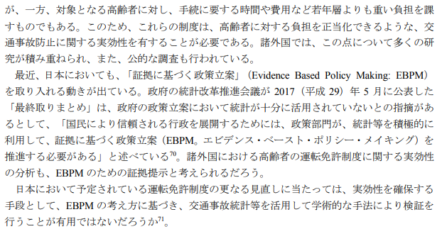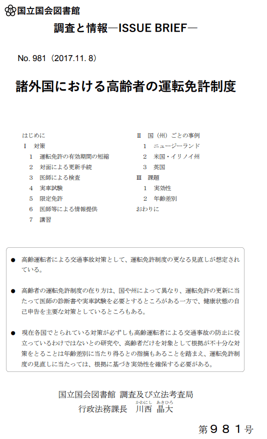 高齢者の運転免許制度の在り方については下記の様な調査報告があるが、警察庁をはじめ法律を審議する国会議員や審議委員会では読んだ形跡もない無責任さが見える。国会図書館は何のためにあるのであろう? これは一部の学者の意見とでも云うのであろうか。