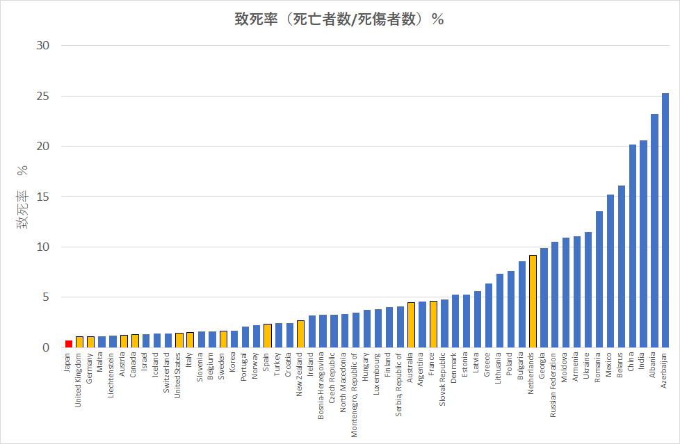 OECDに報告されたデータベースから計算した致死率(死者数÷死傷者数)%表示したもの。2000年から2018年までの平均値。
