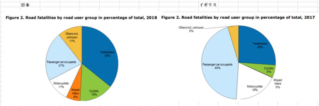 日本は歩行中および自転車乗用中の死者が最も多く、イギリスでは乗用車乗用中が多い。