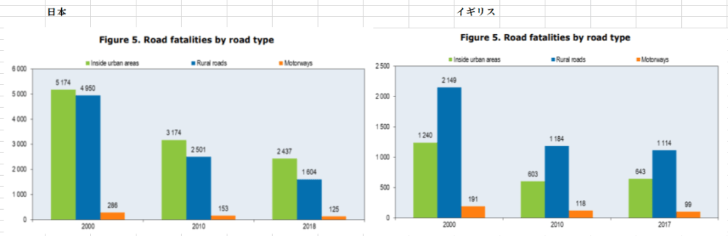 日本とイギリスの交通事故死亡統計の比較 IRTAD2019報告書記載のグラフより