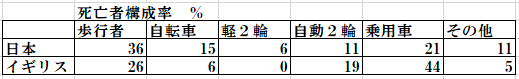 これを見る限り、日本の高齢者の歩行が多いことが、事故による死亡率が高い原因とみるべきであろう。乗用車乗車中の事故死率は日英殆ど変わらない。