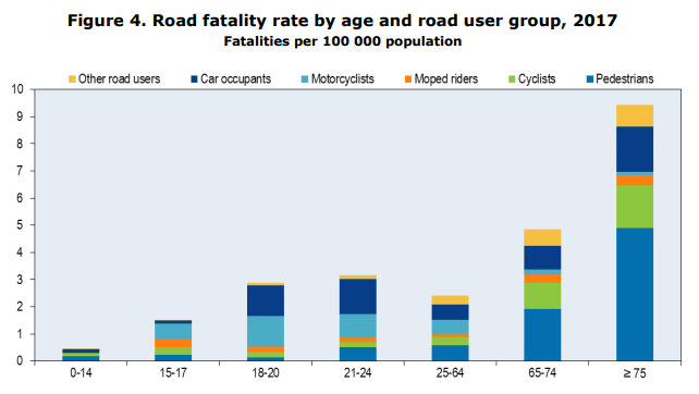 総合的な高齢者の交通事故死者を減らすためには、高齢者の乗用車利用が続けられるよう保護政策を勧めるべきで、高齢者の免許条件を厳しくし歩道に放り出すことは、総合的な交通事故死亡者を増やすことにしかならない。これはその証拠を示す一例であろう。